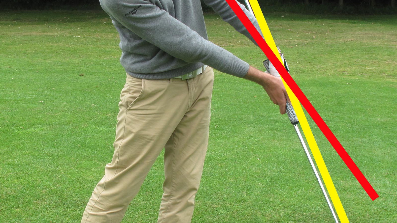 If you finish on the red line, or anything past it, your top wrist has bent forward causing the club to go higher into the air, which normally means that you've hit the ground first. Finishing on the yellow line will almost always mean you've struck the ball first.